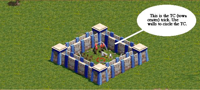 TC trick This trick can either get you and instant resign of your enemy, or waste your enemies' 200 wood. When you attack the enemy and he lost almost everything except a couple of fleeing vill. and his TC, you can use this trick. When the enemy lost his camp's defence, and have fleeing vill., they'll surely build a couple of storage pits and granary to gather food and wood to do some payback. At this time you can build walls around it's TC tightly so it won't have eneough place to put his vill., at these times the enemy either delete the TC to build another one or he resigns instantly. I do this some time when I'm winning. The following is a screenshot: